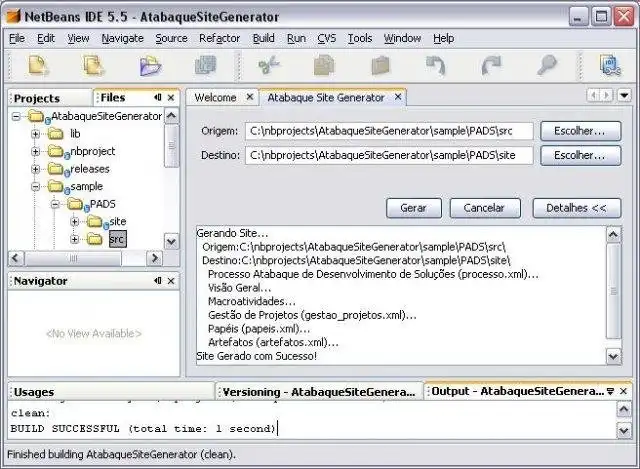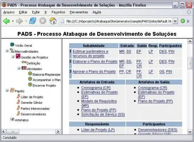 XML/HTML based tool for colaborative process modeling. The process content is stored as XML documents, transformed into HTML using XSL templates. It´s useful to generate processes web sites (like RUP) having separation between content and exhibition.