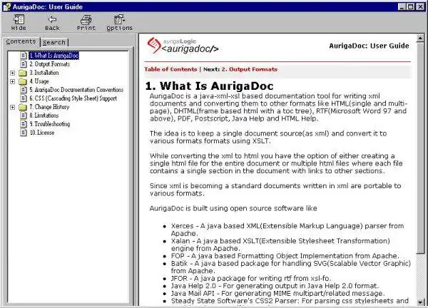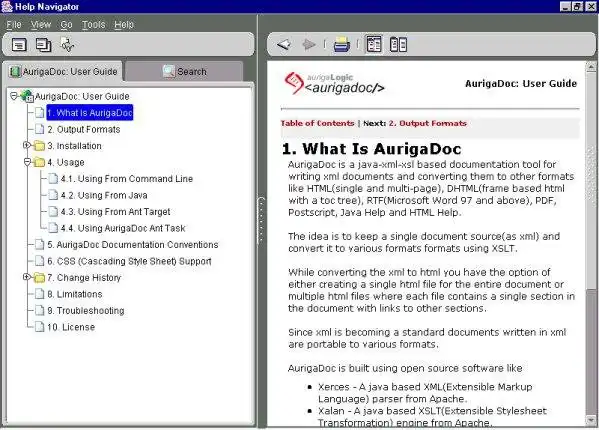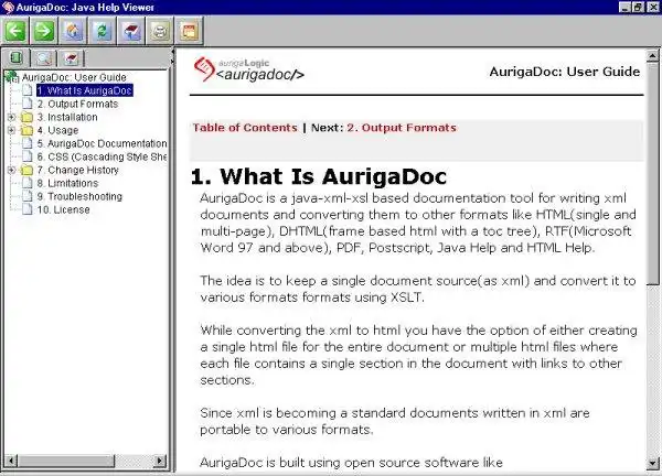 AurigaDoc is a java-xml based documentation tool for writing documents in xml format and converting them to other formats like HTML, DHTML, PDF, PostScript, Formating object(FO), RTF, Java Help, HTML Help, Oracle Help, etc. AurigaDoc is not an xml editor