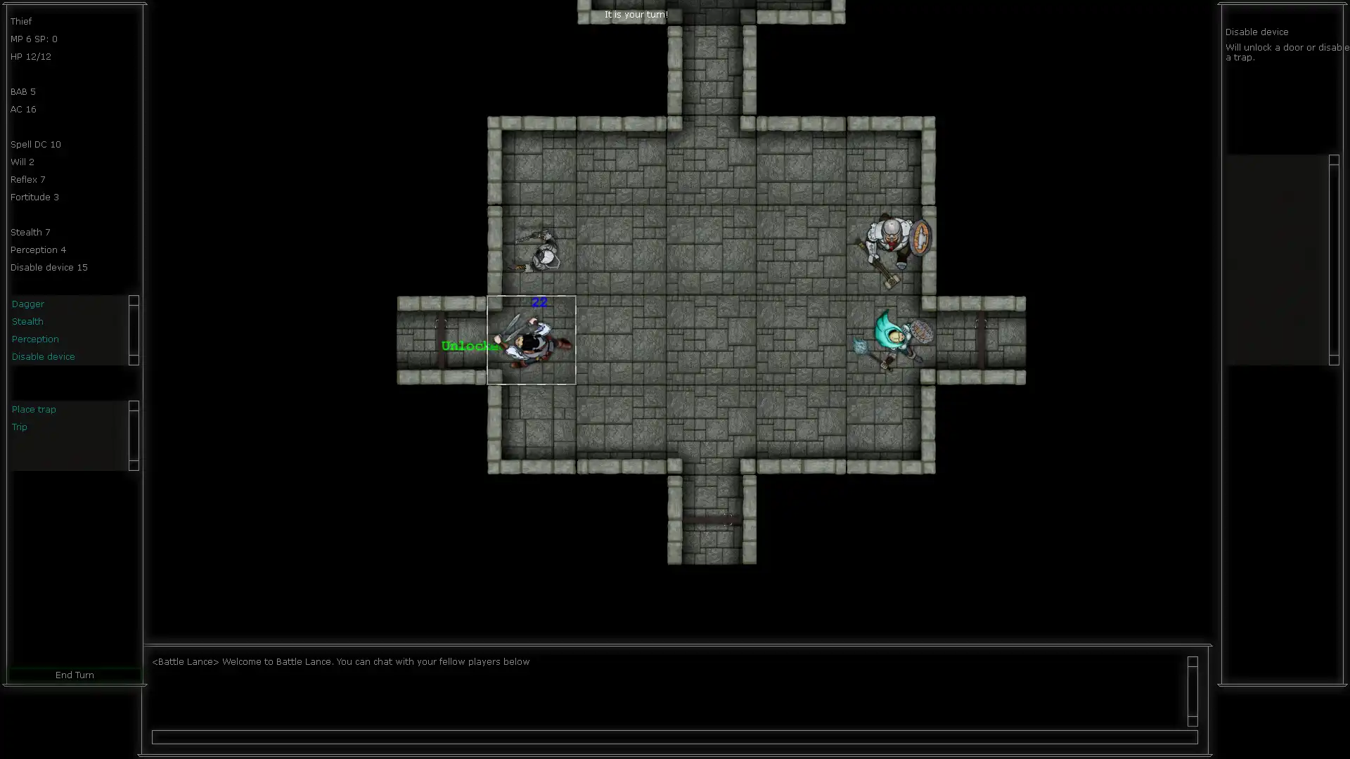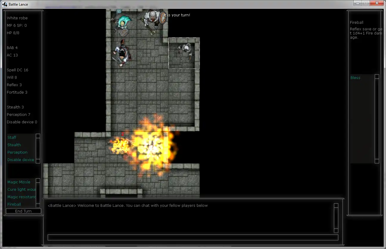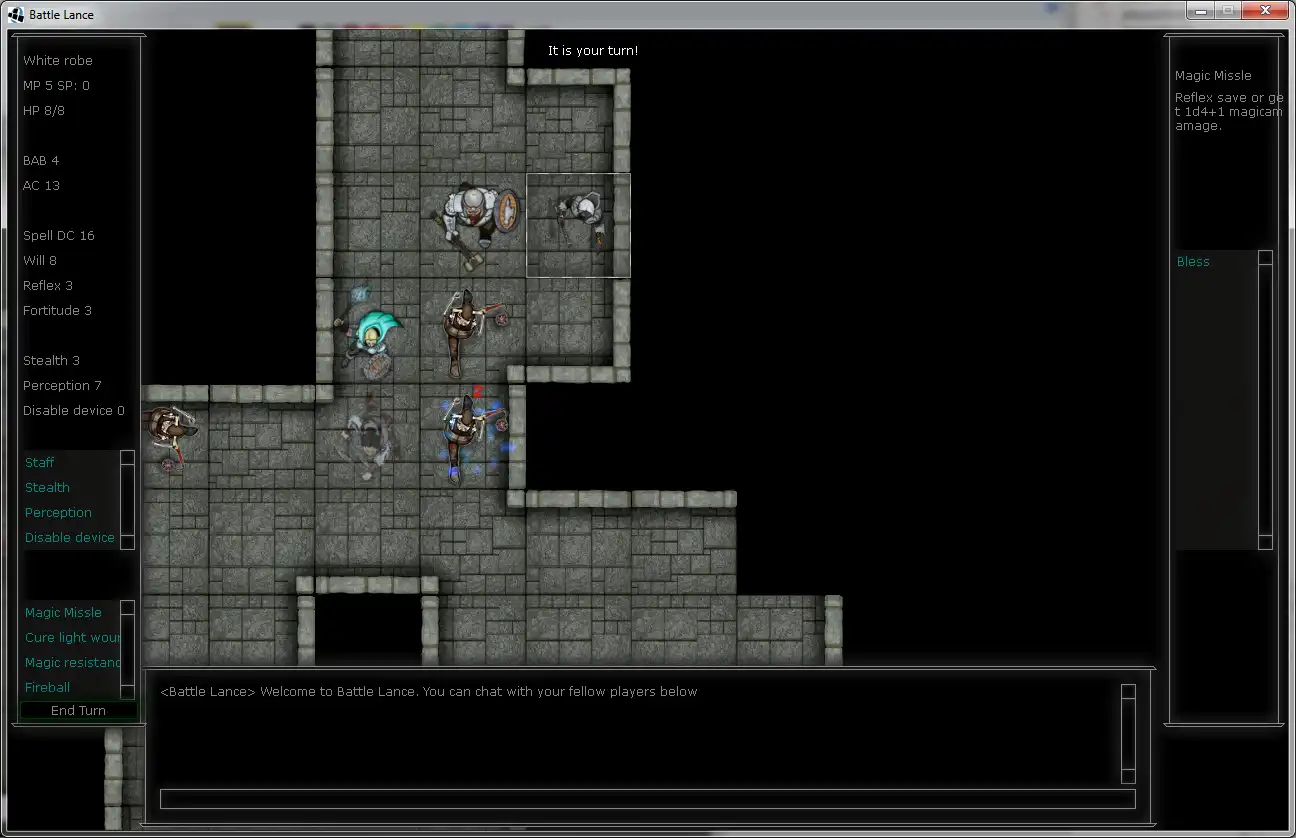 Battlelance is a turn based multiplayer RPG game based on DnD and the likes. You can control a wizard, fighter, thief, cleric or a whole party of these and pit them against a dungeon master or other characters/parties.You can also take up the role as dungeon master and spawn enemies, traps and do other nasty tricks to make life of the characters as difficult as possible.
