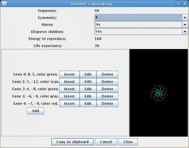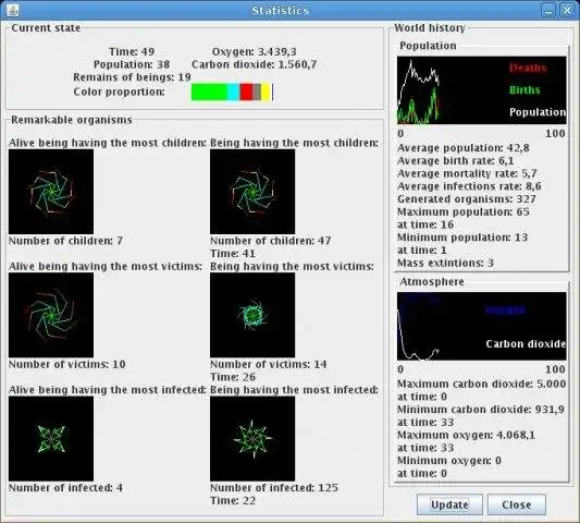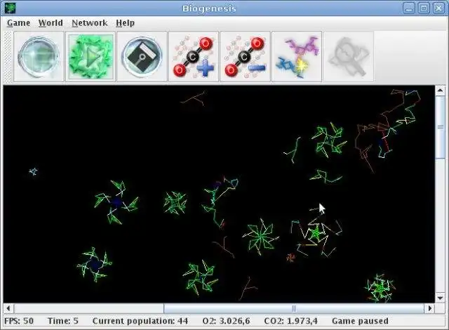 Biogenesis is an artificial life program that simulates the processes involved in the evolution of organisms. It shows colored segment based organisms that mutate and evolve in a 2D environment. Biogenesis is based on Primordial Life.