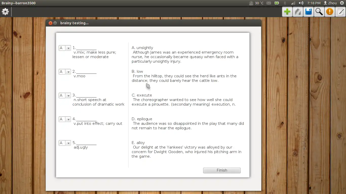 Brainy is a software designed for people, especially students to conquer words such as Barron's SAT 3500. Building vocabulary for standard test is a hard work but with the help of brainy, the efficiency can be higher than before. The program will not only contain the function of a traditional memory-helping software but also new ways that imitate how students learning through real classes.