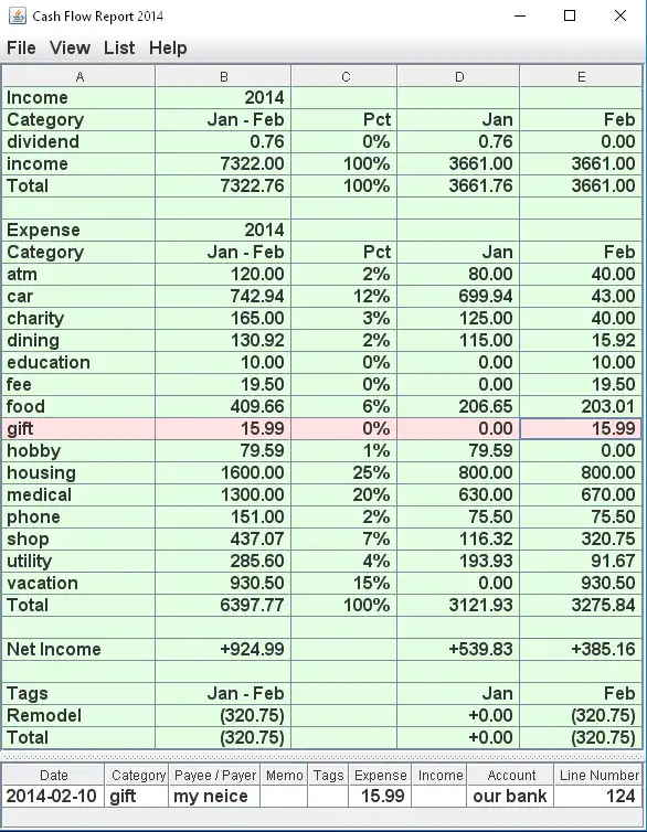 Cash Flow stores data in text files. The fields in a transaction are colorized by a built-in text editor. Take advantage of the Auto-fill feature to type in previously encountered names quickly.