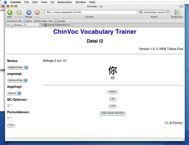 ChinVoc is a vocabulary trainer for learning Chinese. One can input word lists containing Chinese signs, Latin transcription (Pinyin), and the English translation. ChinVoc can be used to train the word lists in various ways.