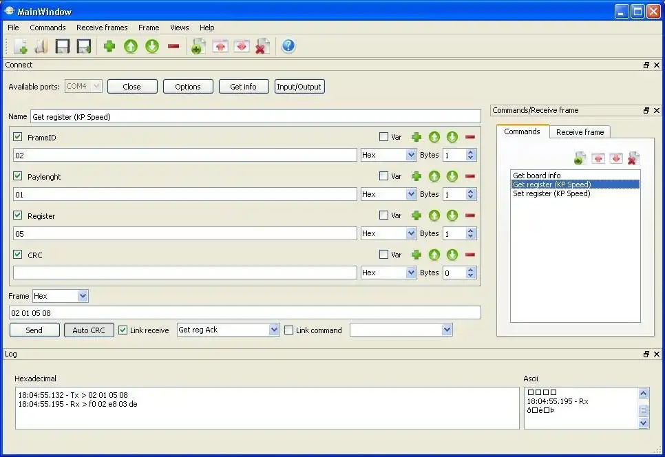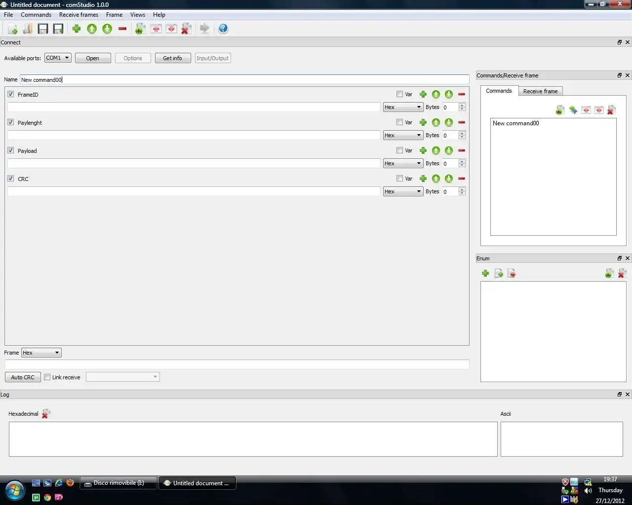 With COM studio is possible to create a set of command frames to be sent to the COM port and decode the answers coming from the device. The serial protocol can be fully customized with a graphical user interface.