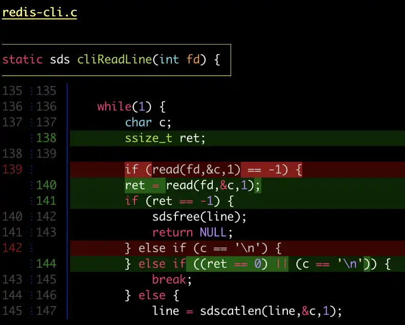 - Delta restructures the git output slightly to make the hunk markers human-readable: