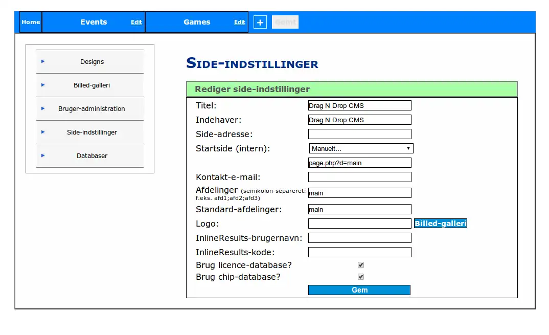 The design of this CMS is changed by using the mouse. Most elements can be reordered by dragging them and the color is changed by double click.The site was created for sports federations. It includes