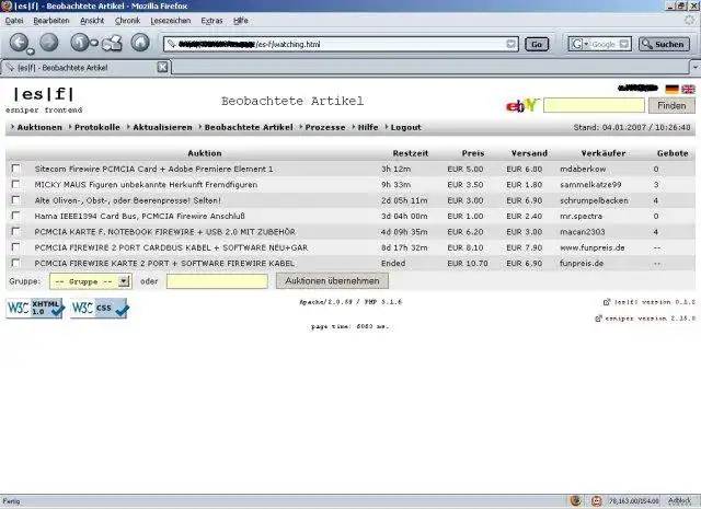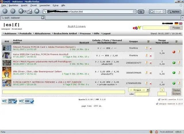 |es|f| is a web based HTML frontend for esniper, a lightweight console application for sniping eBay auctions.It's written in PHP + Javascript and uses text files for all data storage, no database required.