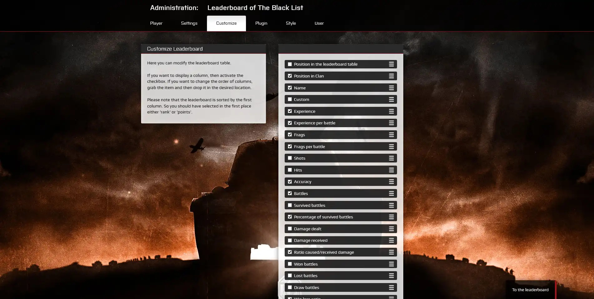 You can install ezStats on your own webspace and run it as a standalone website and at the same time as a native plugin for your CMS. Choose from many supported languages and modify your leaderboard in the easy-to-use adminpanel. You can select one of eight different color schemes, choose from different background images and add your own clan banner.