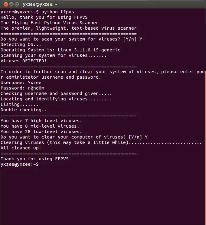 Flying Fast Python Virus Scanner (Also known as Funny Fake Prank Virus Scanner) is a fake, multi-platform, text-based virus scanner written in Python. The goal of the program is to prank your friends into downloading the software, which, when run, pretends to scan their system for viruses. It then prompts for administrator username and password, and once entered, saves them to a text file called 'userpass'. It then pretends to fully detect and clear all of the viruses.