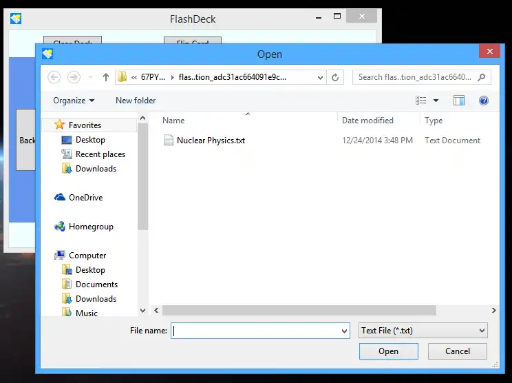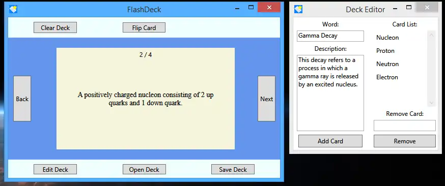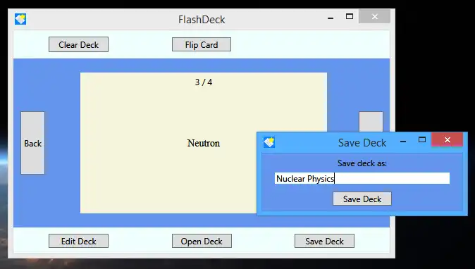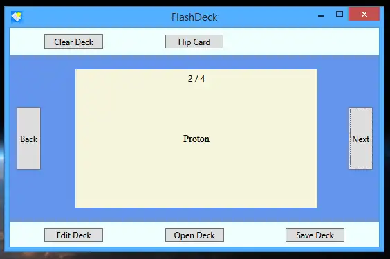 This is an application that can also be fetched from https://sourceforge.net/projects/flashdeck/. It has been hosted in OnWorks in order to be run online in an easiest way from one of our free Operative Systems.