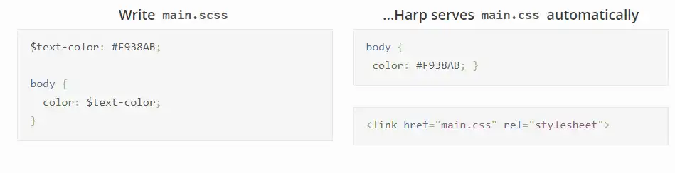 Harp is a static web server that also serves Jade, Markdown, EJS, Less, Stylus, Sass, and CoffeeScript as HTML, CSS, and JavaScript without any configuration. It supports the beloved layout/partial paradigm and it has flexible metadata and global objects for traversing the file system and injecting custom data into templates. Optionally, Harp can also compile your project down to static assets for hosting behind any valid HTTP server. Pre-compilers are becoming extremely powerful and shipping front-ends as static assets has many upsides. It's simple, it's easy to maintain, it's low risk, easy to scale, and requires low cognitive overhead. I wanted a lightweight web server that was powerful enough for me to abandon web frameworks for dead simple front-end publishing. Harp can be used as a library or as a command line utility. You may also use harp as a node library for compiling or running as a server.