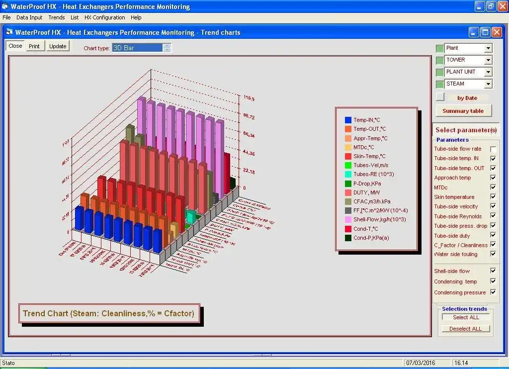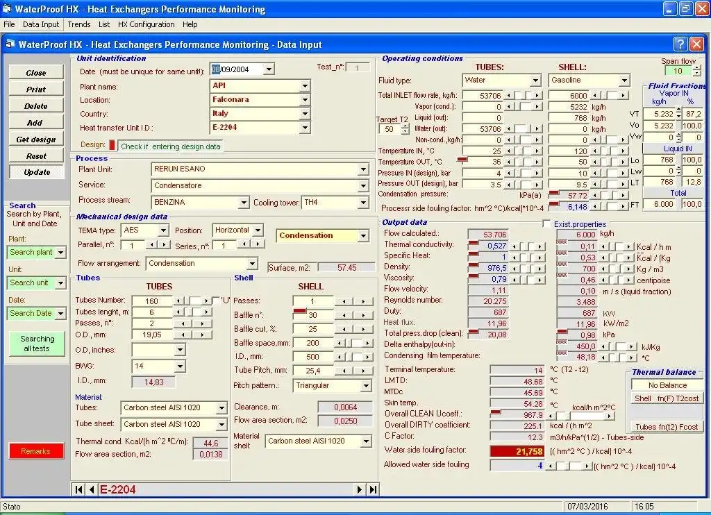 Heat exchangers performance monitoring in industrial plants. The software, developed in visual basic 6, has the capability to input design and actual operating data and compute the water fouling base on meccanical and physical data of the exchanger.