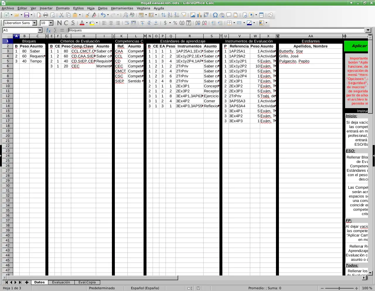 Es una hoja de Libreoffice Calc con una macro para a partir de unos datos introducidos (Resultados de aprendizaje, Criterios de evaluación, Instrumentos de evaluación, distribución de estos en los parciales y estudiantes) crear una tabla en una nueva hoja con todas las formulas necesarias para calcular las notas por RA y por parciales a partir de las notas obtenidas por los estudiantes en cada IE.
