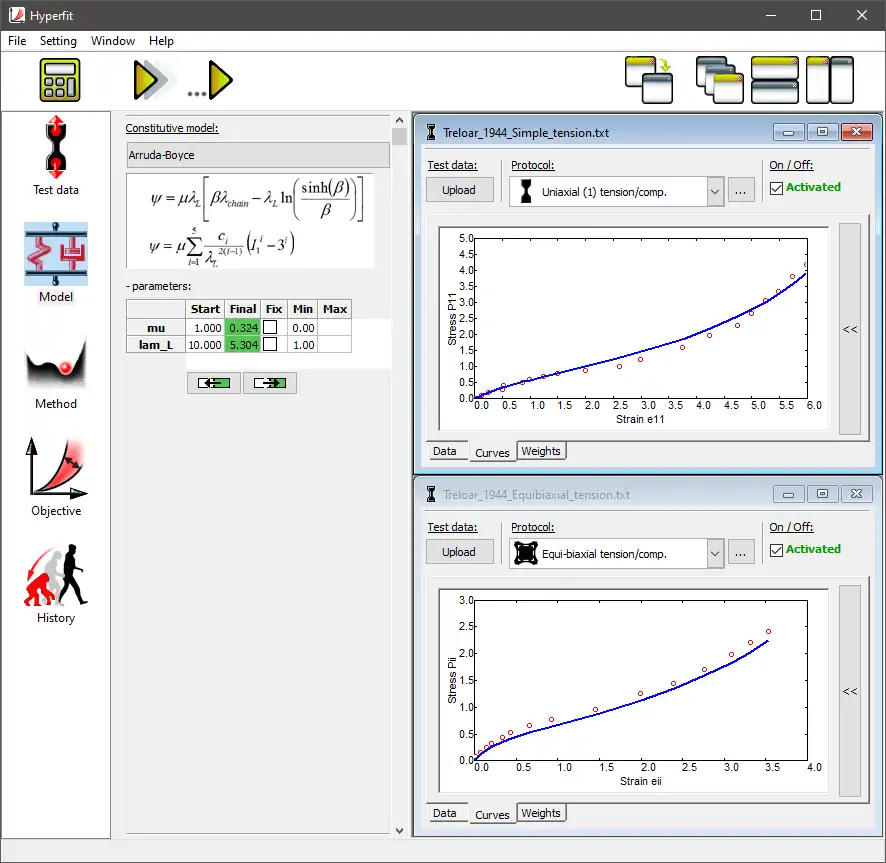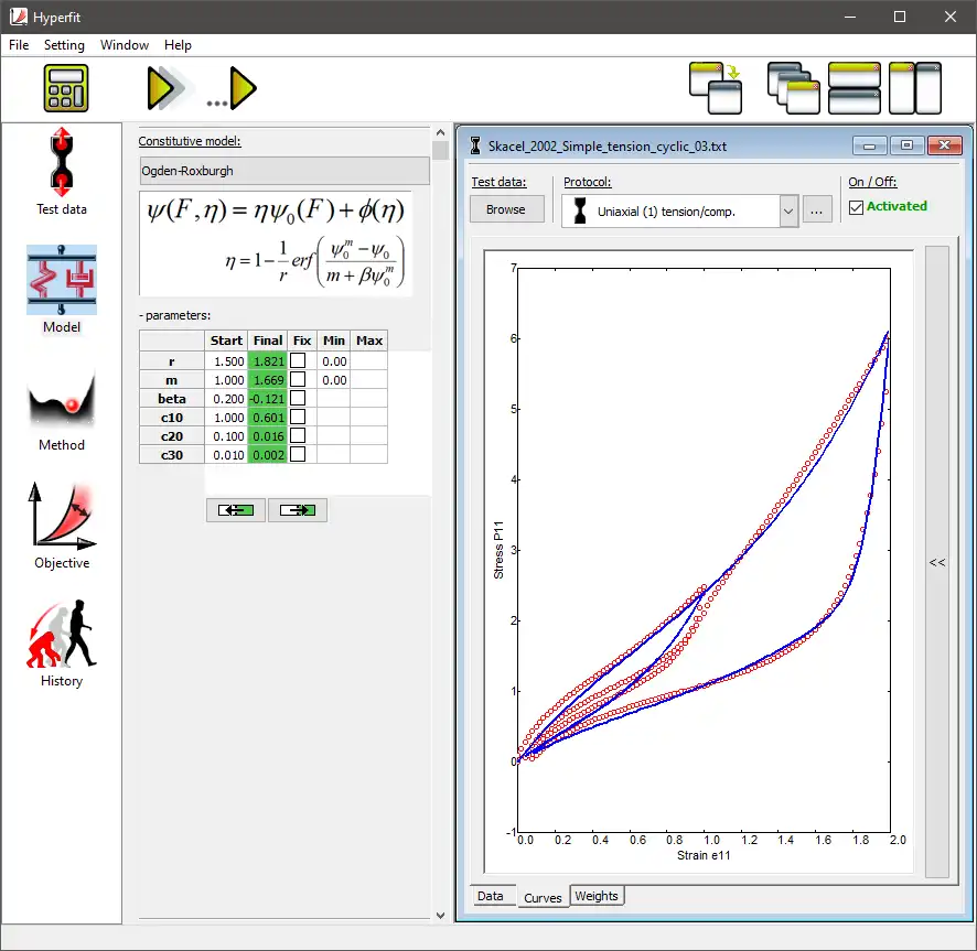 This software allows to fit various hyperelastic constitutive models. Optimal set of parameters of a selected constitutive model can be identified. Many advanced setting, methods and corrections are available to get optimal results according to the user's preference.