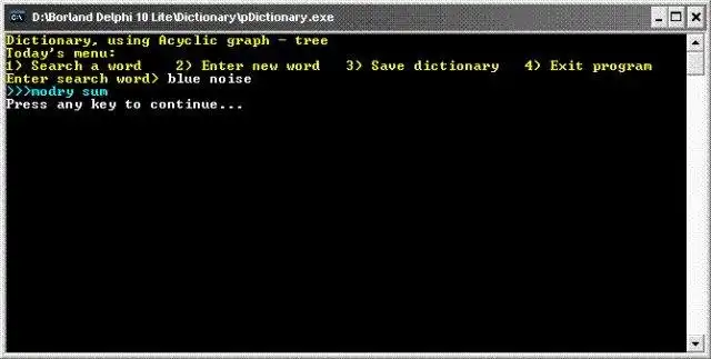 Dictionary-tree is a standard dictionary, means a lexicographic tree (acyclic graph), where letters are nodes of tree, starting from root going down to leaves. You can Get and Add words, Clear and Save the whole dictionary. C++ and Pascal.