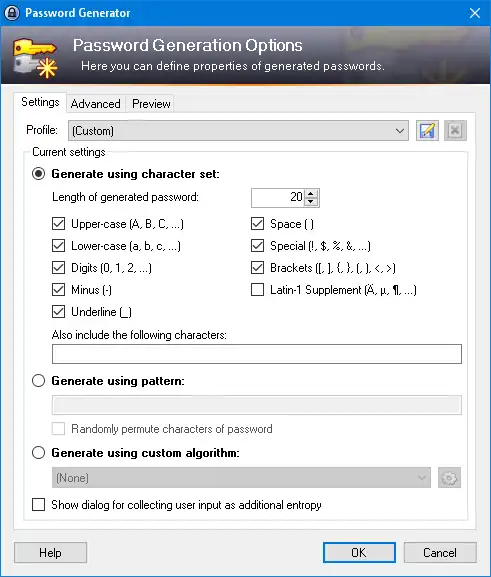 - Powerful password generator (generation based on character sets and patterns, with many options).