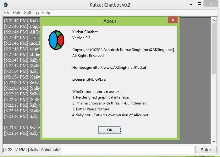 KutKut ChatBot is a chatter bot program, developed to chat with you using artificial intelligence. You can chat with this program as you talk to a human. It features a GUI interface to send and receive chat messages and many more features.