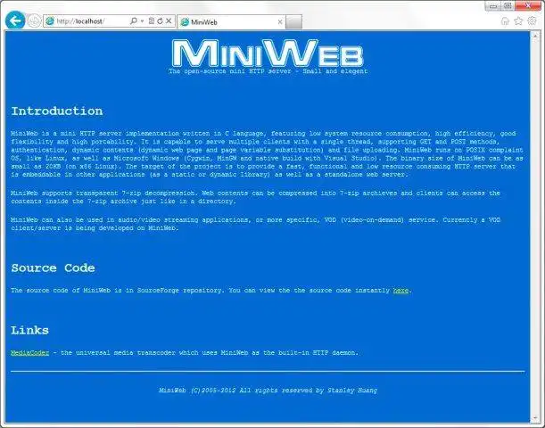 MiniWeb is a high-efficiency, cross-platform, small-footprint HTTP server implementation in C language. It implements GET and POST methods and works on multiple platforms ranging from server, desktop, game console and IoT hardware.