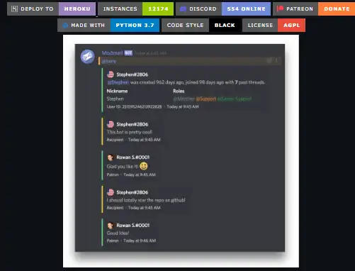 Modmail is similar to Reddit's Modmail, both in functionality and purpose. It serves as a shared inbox for server staff to communicate with their users in a seamless way. This bot is free for everyone and always will be. If you like this project and would like to show your appreciation, you can support us on Patreon, cool benefits included! When a member sends a direct message to the bot, Modmail will create a channel or "thread" into a designated category. All further DM messages will automatically relay to that channel; any available staff can respond within the channel. Schedule tasks in human time, e.g. ?close in 2 hours silently. Editing and deleting messages are synced. Support for the diverse range of message contents (multiple images, files). Paginated commands interfaces via reactions. When you close a thread, Modmail will generate a log link and post it to your log channel.