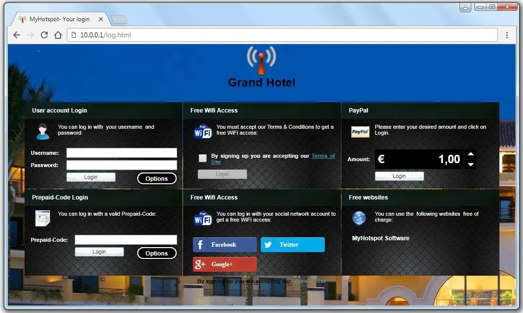 MyHotspot is a professional Wireless LAN Free software solution for providing internet access to your customers. Customers will be redirected to your login page to authenticate with user account or a prepaid-code before getting the Internet access. The PayPal payment option allows your customers to create and pay for network access directly. The software controls download, upload, data transfer, time usage, visited pages. MyHotSpot Billing software runs on your Windows PC, controls unlimited user or prepaid-code accounts, and displays data to customers on your self-branded pages.