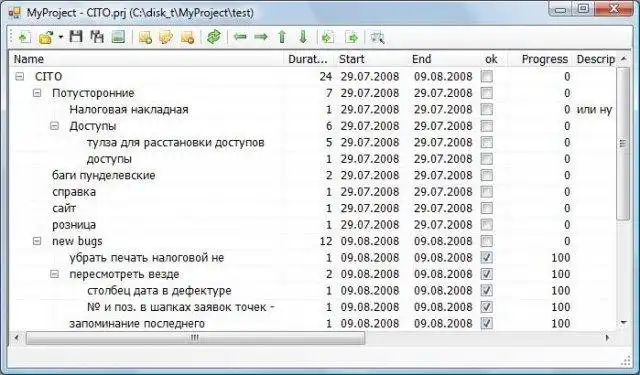 MyProject - simple desktop program for project management writen on C#&.NET2.0 - task tree, start/end, duration. Simple and easy. Has extended shortcut support, can export node as independent file - and export to.