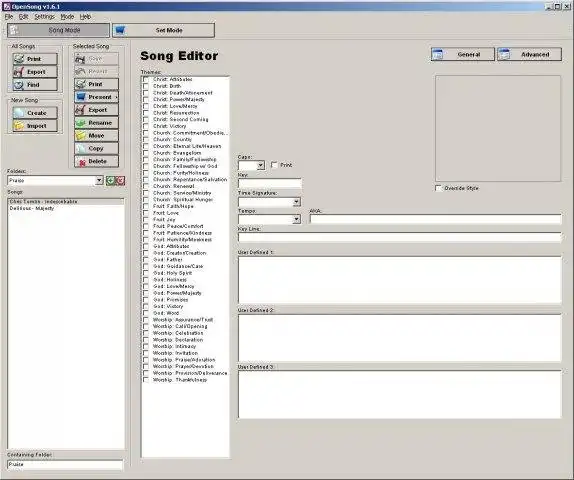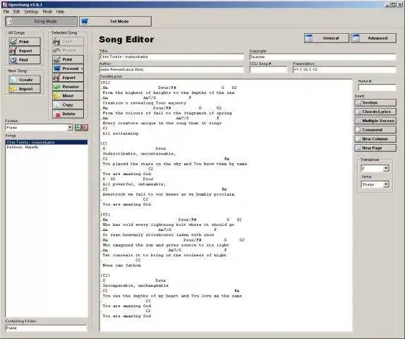 - Keep track of a song's title, author, copyright, ccli #, tempo, time signature, theme, focus, capo position, user defined fields, and more!
