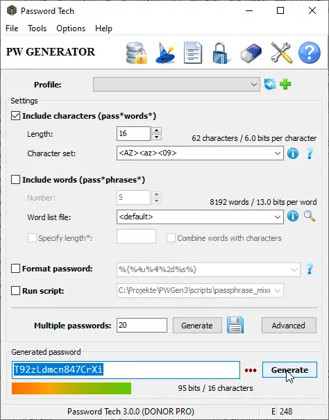 Password Tech is a powerful password generator capable of generating large amounts of cryptographically-secure passwords, pronounceable passwords, pattern-based passwords, passphrases composed of words, and scripted passwords. Passwords can be stored in encrypted databases along with user names, URLs, notes, etc. Password Tech provides lots of options to customize passwords to the users' various needs, and individual scripting with Lua gives full control over the process of password generation. Text encryption is also supported.