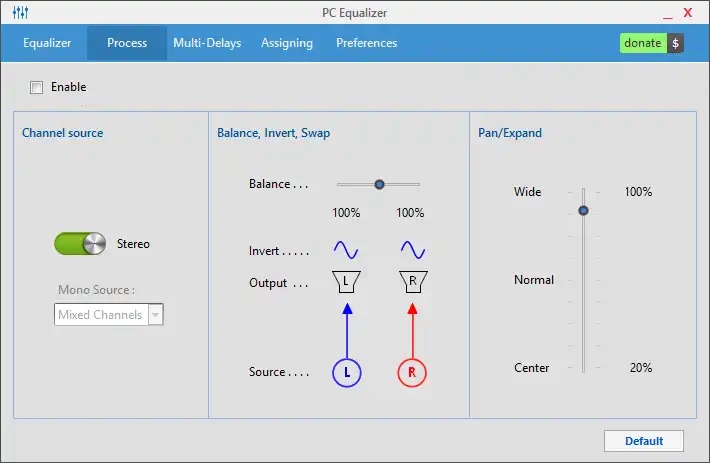 Designed for those who are looking for fixed frequencies equalizer, offering a quick and easy audio filtering with ability to control left-right channels (Stereo, Mono, Swap, Invert, Balance...etc), Expand or contract Stereo using Pan\Expand processing feature.