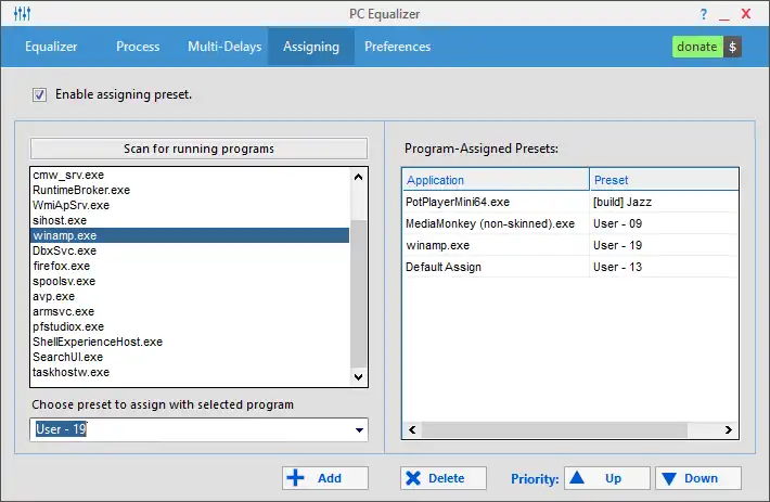 - Assign a preset to a program such as (Winamp, Windows Media Player, PotPlayer...etc), It monitors running programs saved in the "Program-Assigned Preset list" and will show tray notifications at each preset change.
