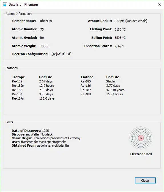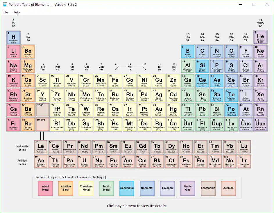 Periodic Table of Elements is a quick reference tool that allows you a quick glance to get general information about an element. The program is for educational purposes.