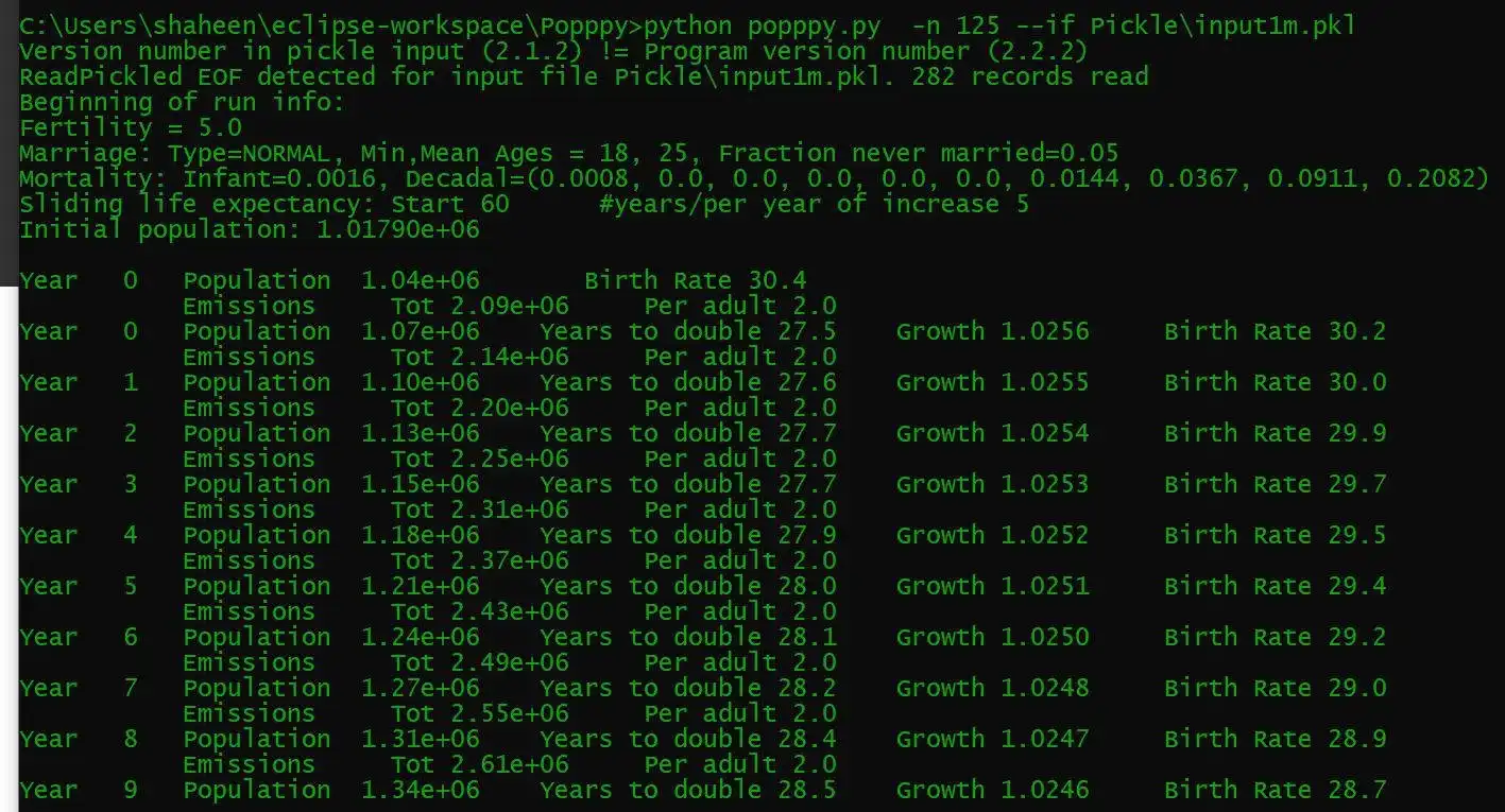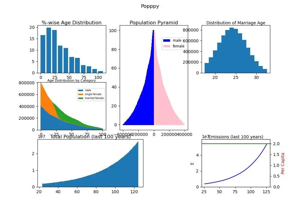 Popppy simulates a population of men and women over a period of time in 1 year time-steps, implementing marriages, births, and deaths. Execution starts with an input consisting of given numbers of men and women of particular ages. It does a decent job predicting 10 to 20 years ahead. Beyond that the input parameters fertility rate, marriage age and mortality rates could change in an unpredictable manner. The tool could also be useful and fun for a student, for anyone curious about near-future demographics or CO2 emissions, or curious amateurs. Since it's Open Source (<2000 lines of Python code) you can make your own changes.