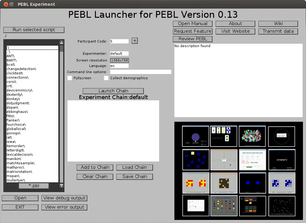 This is the Windows app named Psychology Experiment Building Language whose latest release can be downloaded as PEBL2_Win_Portable_beta6.zip. It can be run online in the free hosting provider OnWorks for workstations.