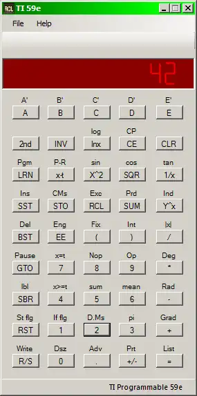 Texas Instruments was one of the bigger companies producing calculators. With RCL it is possible to recreate the TI calculators, strating with the Ti59e, with 960 program steps and a persistant memory (a combination of the the Ti58C and the Ti59).