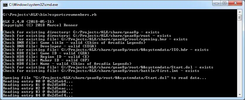 ALX is a very simple, fast, cross-platform and object-oriented command line tool to extract the game data from Skies of Arcadia, Skies of Arcadia Legends, Eternal Arcadia (エターナルアルカディア) and Eternal Arcadia Legends (エターナルアルカディアレジェンド). It is able to export and import the data to and from CSV files.Features