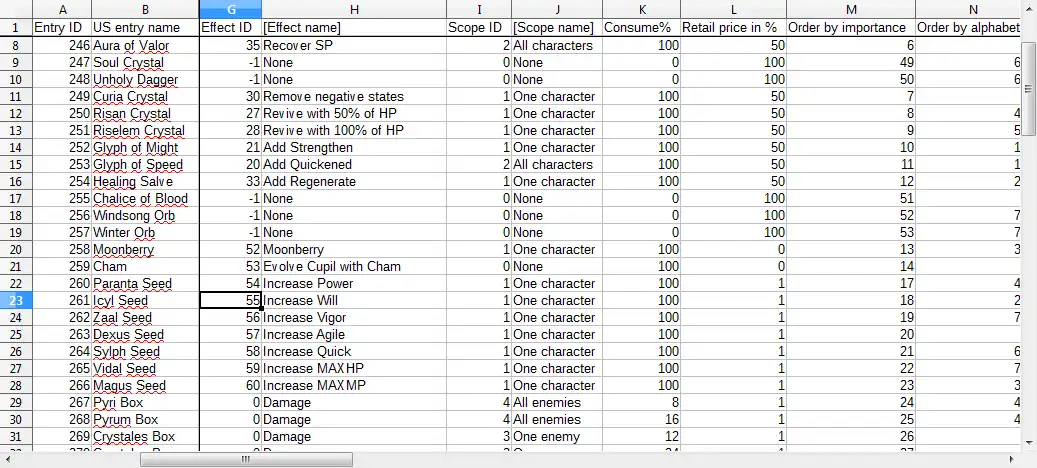 - Character stats (EXP curves, Magic EXP curves and parameters)