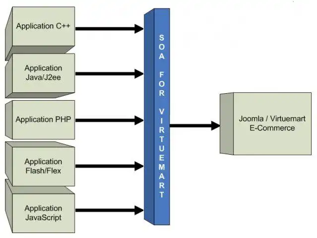 SOA (Service Oriented Architecture) For VirtuemartThe aim of this project is to develop WebServices (SOAP) for Joomla/ Virtuemart. With this component you can connect to Virtuemart with many languages like Java, Flash/Flex, PHP, Javascript, C++, .NET, Iphone API, Android API ... via SOAP.