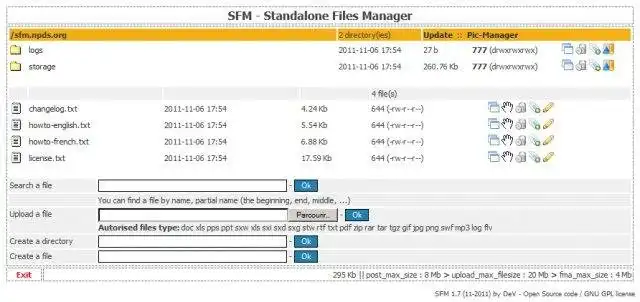 SFM [Standalone Files Manager] is a web-based files manager written in PHP - no database used - full and flexible configuration - HTML template and style (xHtml and CSS) French and English web interface // Multimedia' galery [Pic-manager] with extendable capabilities