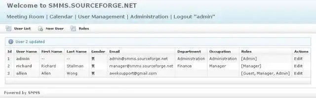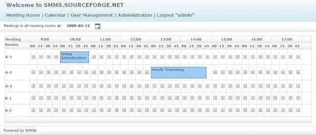 SMMS(Swift Meeting Management System) is web-based meeting resource scheduling system. The SMMS is base on Java web technology (Groovy/Grails), it intend to be easy to deploy, use, extend, and integrate.
