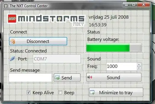 This is a 'Control Center' for connecting to LEGO Mindstorms NXT. You can read the battery voltage, send a message and make a sound. More options, like viewing sensor information, are under development, but suggestions for more functions are welcome.