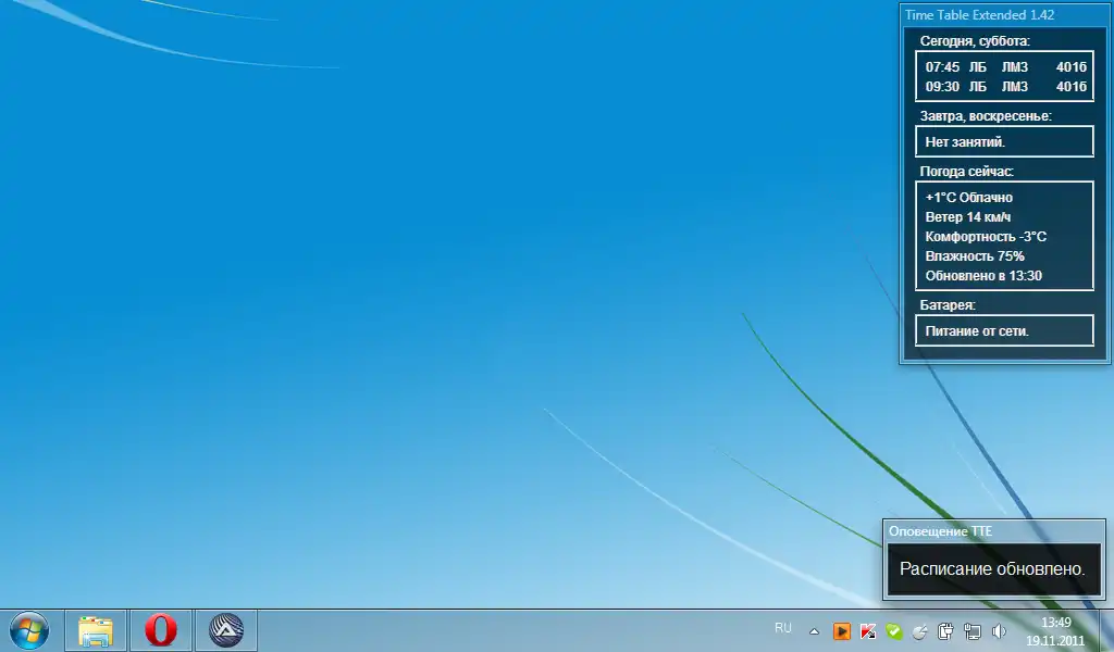This program is used to display the student’s timetable of the KNURE university. Also includes modules to keep the events(mini-sheduler), current info about weather, info about notebook battery and RSS reader.