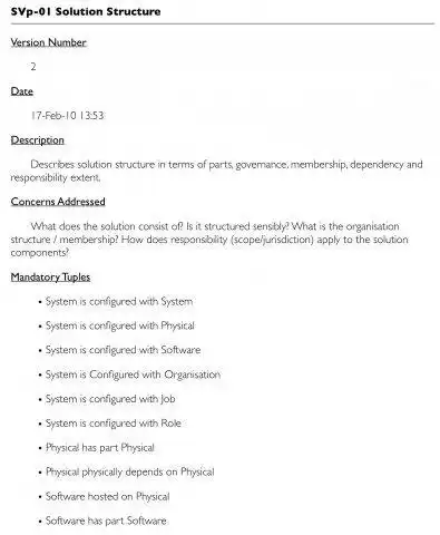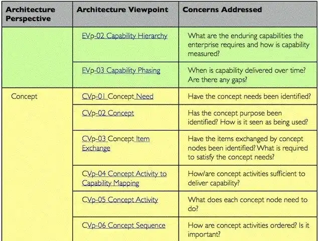 - architecture viewpoints cover enterprise, concept, procurement, solution and management & everything from structure, behaviour, interchange to assurance, requirements and the architecture description task itself