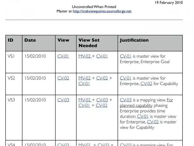 Defines a total of 24 viewpoints. The ones needed are selected by taking the task sponsor's concerns and matching them to the typical concerns that each TRAK viewpoint addresses. The triples that address each concern are defined in the TRAK metamodel (https://sf.net/p/trakmetamodel).