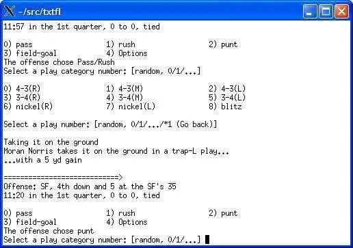 tXtFL is a strategy-based football simulator. Teams can be created from real stats on the web, built through custom designed plays, and then used to coach games or predict scores. Note that as of 2010, all new development is taking place at http://textflex.com/txtfl.