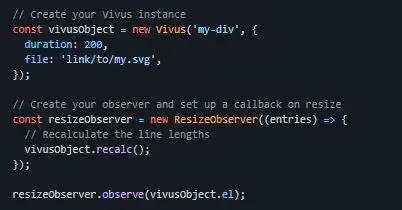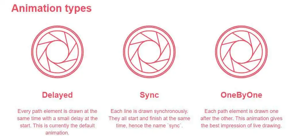 Vivus is a lightweight JavaScript class (with no dependencies) that allows you to animate SVGs, giving them the appearence of being drawn. There are a variety of different animations available, as well as the option to create a custom script to draw your SVG in whatever way you like. Every path element is drawn at the same time with a small delay at the start. This is currently the default animation. Each line is drawn synchronously. They all start and finish at the same time, hence the name `sync`. Each path element is drawn one after the other. This animation gives the best impression of live drawing. To give more freedom, it's possible to override the animation of each path and/or the entire SVG. It works a bit like the CSS animation timing function. But instead of using a cubic-bezier function, it use a simple JavaScript function. It must accept a number as parameter (between 0 to 1), then return a number (also between 0 and 1). It's a hook.