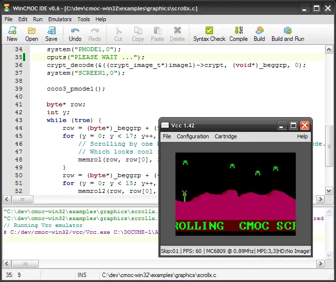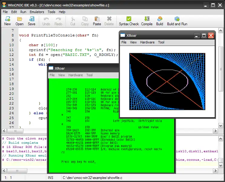 A simple C editor in included which makes it easy to compile/build and run the xroar emulator.