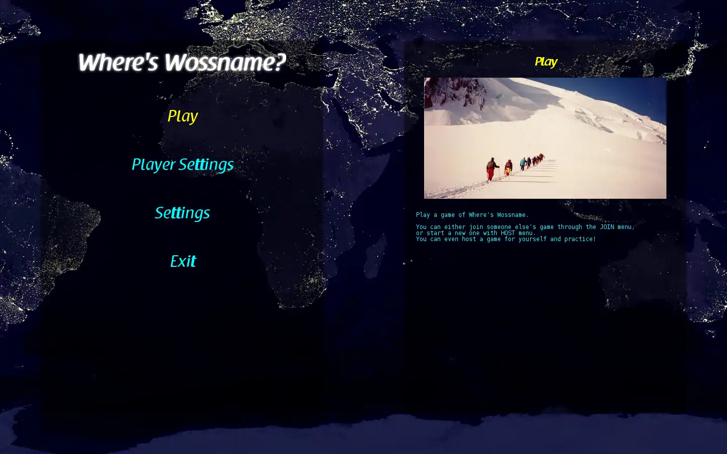 "Where's Wossname?" is a multiplayer geography game, where players compete against each other by guessing requested locations on the map. Each player's answer is scored according to its accuracy and haste.